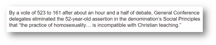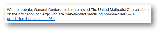 They also no longer consider adultery a sin for clergy by redacting it from their Book of Discipline.7 Conversely, God, while dictating his ten commandments, says, “You shall not commit adultery.” (Exodus 20:14) A little explanation here: both “immorality” and “sexual misconduct” are still not allowed per the Book of Discipline, but they are undefined. So, how does the UMC define them? They certainly can’t be referencing the Bible or else LGBTQ would still be unacceptable. Thus, despite whatever UMC leadership may verbalize, their written words now allow adultery among clergy.