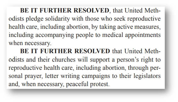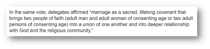 UMC leadership stated they believe it is OK to kill babies, as long as they are still inside the mother (abortion).4 Further, they extended this resolution to the entire world, stating they will support it through lobby and protest. However, God states, “You shall not murder.” (Exodus 20:13) Additionally, God’s exquisitely intimate relationship with his creation at this most vulnerable time is explained in Psalm 139: “For you formed my inward parts; you covered me in my mother’s womb. I will praise you, for I am fearfully and wonderfully made; marvelous are your works, and that my soul knows very well. My frame was not hidden from you, when I was made in secret, and skillfully wrought in the lowest parts of the earth. Your eyes saw my substance, being yet unformed. And in your book they all were written, the days fashioned for me, when as yet there were none of them.” And finally, when God lists seven things that are an abomination, he includes, “hands that shed innocent blood”. (Proverbs 6:17)