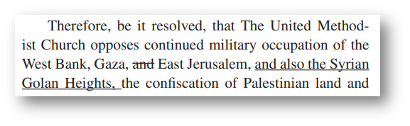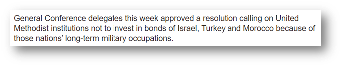 UMC leadership urges the U.S. and “all governments to end all military aid, arms transfers and arms sales to the region”. 5 In context, the “region” includes Israel. They also no longer allow investments in Israeli bonds.6 God says, “I will bless those who bless you, and I will curse him who curses you”. (Genesis 12:3)